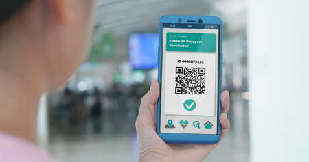 Woman traveler using digital vaccination certificate for travel during covid-19 pandemic.