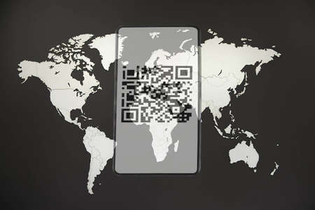 Qr code mobile. Digital mobile smart phone with qr code scanner on smartphone screen for online pay, scan barcode on black background. Qrcode payment, online shopping, cashless technology concept