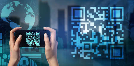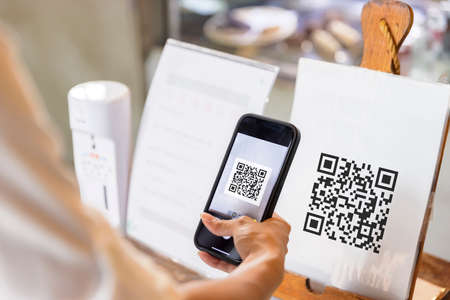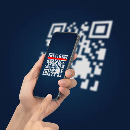 Hand using mobile smart phone scan Qr code. Barcode reader, Qr code payment, Cashless technology, Digital money concept.