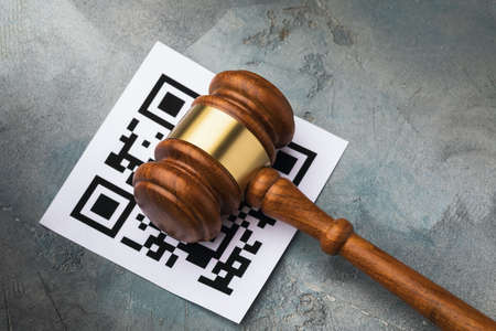 Judge gavel and barcode on the table, the concept of administrative punishment for non-compliance with the vaccination regime using QR codes