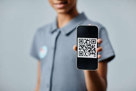 Close up of cute African-American girl showing QR code after getting vaccinated, copy space
