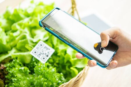 Customers buy organic vegetables from hydroponics farm and pay using QR code scanning system payment at food market shop. Technology and futuristic business. E wallet and digital cashless concept