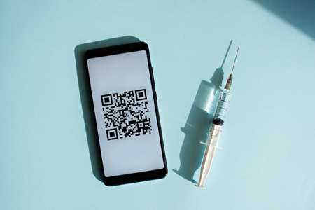 Smartphone with quar code of vaccination certificate on the screen, syringe and medical mask on a light blue background.