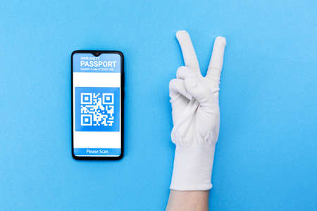 Hand in gloves and electronic Immunity passport with a COVID-19 vaccination stamp and qr-code on a smartphone screen on the blue background. Flat lay. Concept of vaccination and digital passport.