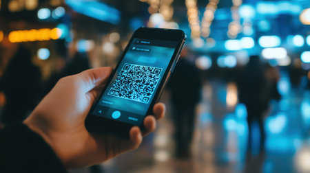 A hand holds a smartphone displaying a QR code, showcasing digital payment technology in an active urban area filled with people, illuminated by bright lights.