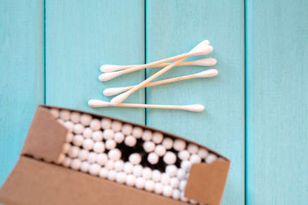 Cotton buds stick out of the package on a blue background. Place for text. copyspace. Layout for design.