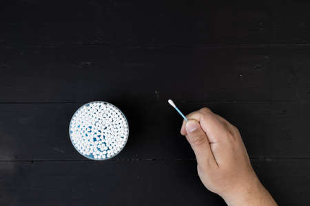 Hygienic cotton swabs on a blue table. Medical items on a black background