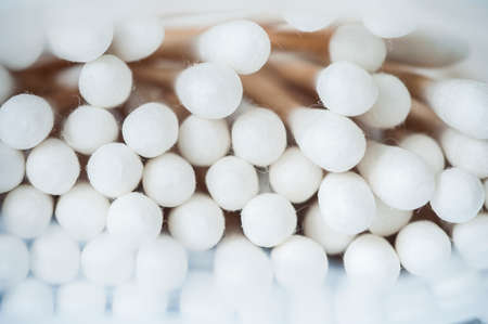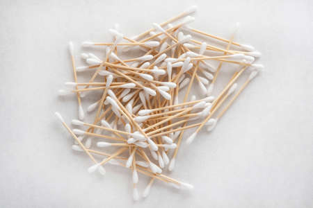 A group of ear swabs or cotton ear sticks on the light background. Ear care concept for Hygiene.