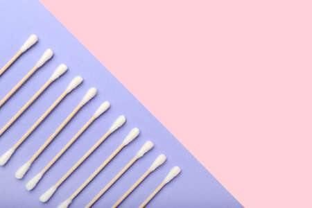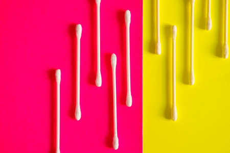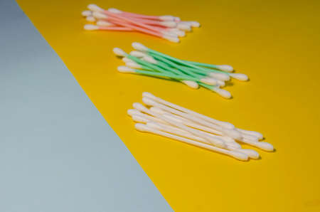 Minimalist background with cotton swabs of different colors on a two-color background. Concept of hygiene, body care, health care. View from above at an angle. Selective focus.