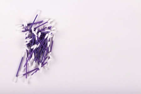 a heap of purple cotton buds on a white background, hygiene concept, copy space