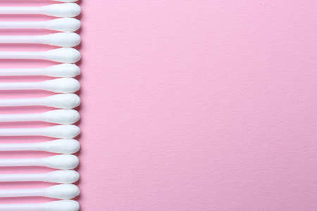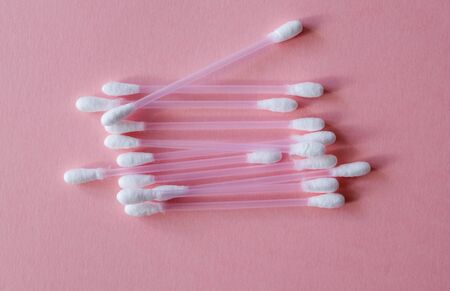 Flat lay cotton buds on pink warm background. Pattern of cotton swubs, beauty and health care concept. Cotton composition