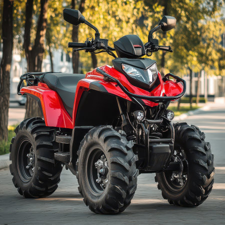 A vibrant red quad bike is parked along a tree lined street during daylight. The setting features clear skies and healthy greenery.