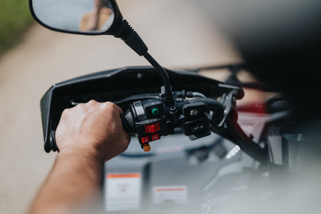 Close-up View of a Hand Operating an ATV Handlebar Controls Outdoors