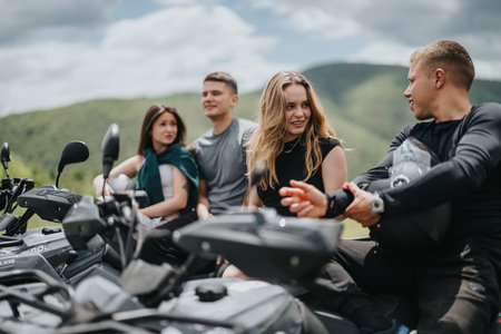 Group of friends bonding outdoors with quad bikes in scenic nature