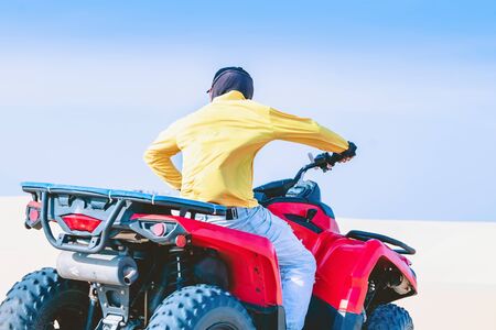 Tourist enjoy riding the quad bike or powerful fast off-road four-wheel drive ATVs at white sand dunes in Mui Ne, Vietnam.
