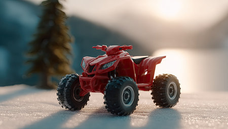 Red toy quad bike on the snow in the winter forest. 3d illustration