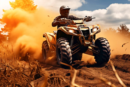 ATV rider navigating through a forest trail during autumn. Generative AI.