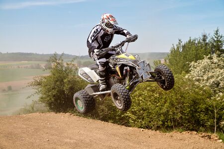 MOHELNICE, CZECH REPUBLIC - APRIL 19: Racer is riding a quad with a smoking engine in the International Championship of the Czech Republic 2014 on April 19, 2014 in MOHELNICE, Czech Republic.