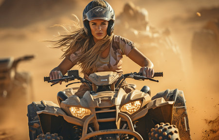 ATVing across sand dunes in the desert of Dubai by a woman