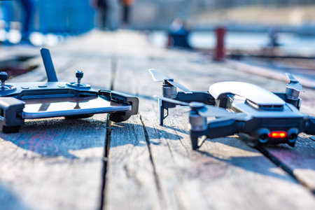 Drone on the ground before take off or after landing. Background with copy space for text
