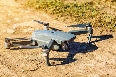 Russia, Poltavskaya village - 28 August 2016. The drone, hovering above the ground. Take-off or landing quadrocopters.