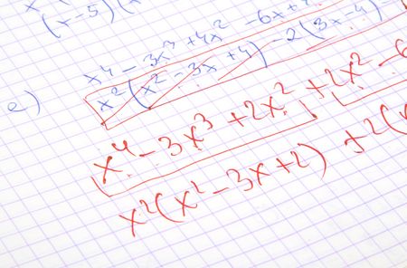 mathematical formulas are written in a notebook. solution school examples in algebra and geometry