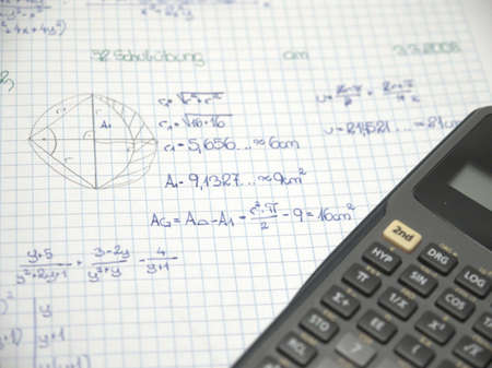 Copybook with handwritten maths formulas and calculator as background, closeup