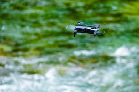Drone flying over green nature water river background, take photo and video