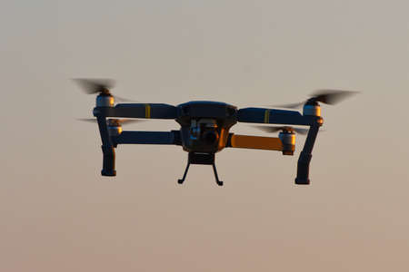 Close up of professional remote control drone flying against dramatic sunset sky background.