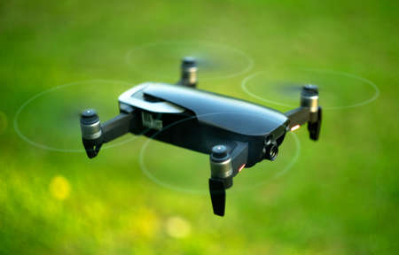 A flying drone with a camera in the air. A black copter flies over the green grass. Video shooting from a drone.