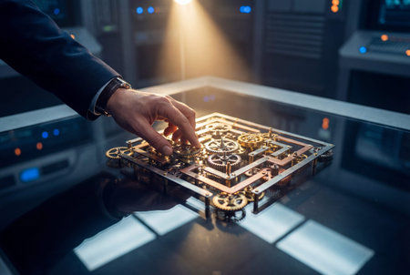 A close up photograph of a person hand touching an intricate mechanical maze made of gears in a futuristic laboratory