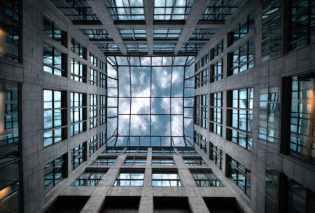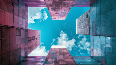 blue sky with clouds between the walls of a modern office building abstract architectural background