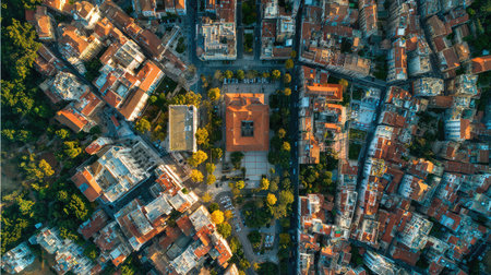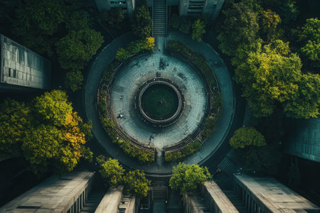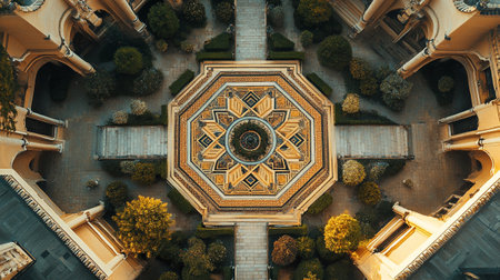 This stunning aerial image captures a symmetrical garden layout showcasing vibrant greenery and intricate pathways, creating a tranquil urban oasis.