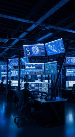 A dimly lit control room with multiple computer screens displaying data and graphs