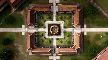 Discover a captivating aerial view of a historic architectural complex featuring intricate courtyards, lush gardens, and serene pathways.