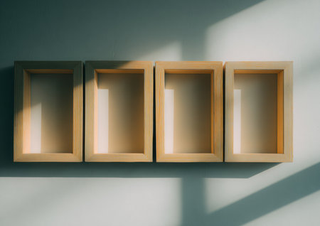 Four rectangular wooden shelves are mounted on a light gray wall, capturing a minimalist aesthetic. The image features natural sunlight casting shadows, highlighting the shelves' textures. This composition may be suitable for interior design themes, home decor visuals, or use as a background for design projects. The overall style is clean and simple.