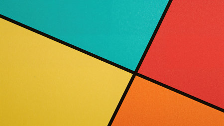 Abstract composition featuring diagonal geometric shapes in vibrant red, yellow, orange, and teal colors. Modern design with bold lines and vivid tones.