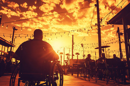 A person in a wheelchair sits peacefully as the sun sets, casting warm hues across the sky.