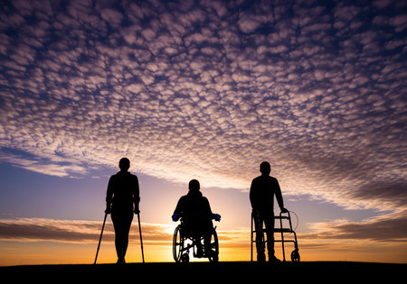 Silhouettes of three individuals with disabilities, using crutches, a wheelchair, and a walker, standing against a vibrant sunset sky. it conveys themes of resilience and support.