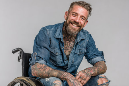Tattooed man in denim shirt, seated in wheelchair, radiating joy and confidence, with a soft neutral background enhancing his vibrant character