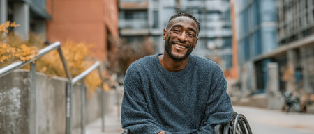 Happy man in wheelchair, dressed in warm sweater, sitting outdoors amidst urban landscape and colorful autumn leaves, radiating positivity and strength