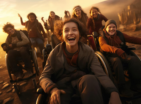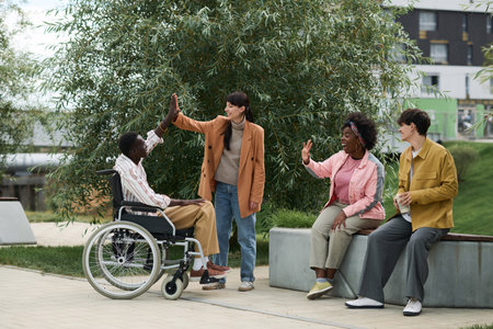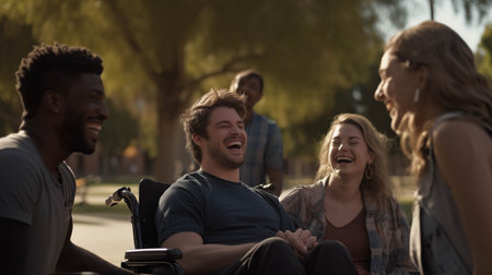 Group of four friends, including one in a wheelchair, sharing laughter and happiness during a walk in a tree lined urban park