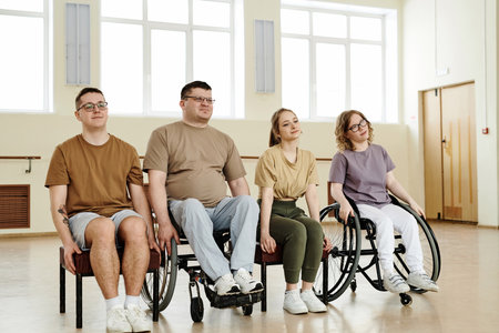 Group of four diverse men and women practicing dance with wheelchairs in studio, long shot
