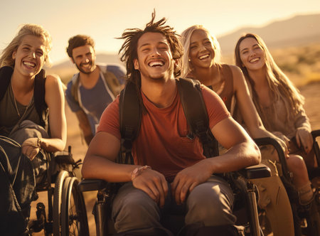 Happy multi ethnic friends enjoying a sunny day together, strolling through a park, supporting their friend in a wheelchair
