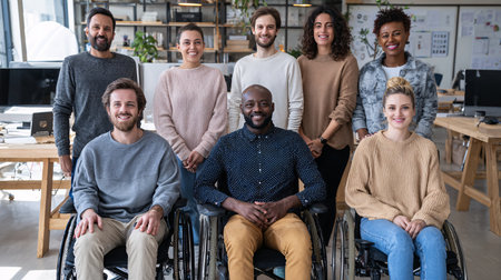 Portrait of disabled businesswoman in a wheelchair in front of her diverse business team at office