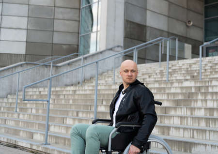 Bald man at black jacket in a wheelchair waiting for help at the bottom of a stairs.