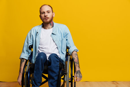A man in a wheelchair looks at the camera, with tattoos on his arms sits on a yellow studio background, the concept of health is a person with disabilities