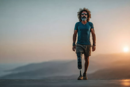 Man with a prosthetic leg is walking confidently in a natural setting during sunset, showing casing resilience and determination in the moment.
