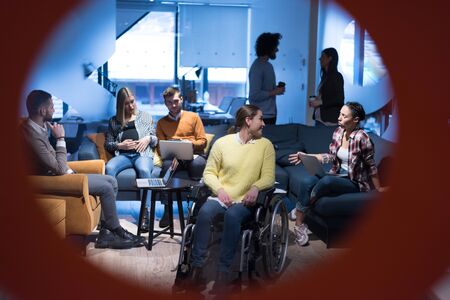 Handicapped young woman with colleagues working in office. She is smiling and passionate about the workflow. Performing in co-working space. Office people working together.