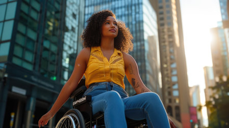 A person confidently navigates a serene urban pathway in a wheelchair, embodying independence under bright sunlight, highlighting the journey of resilience and determination.